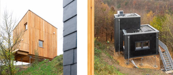 Das erste Haus mit einem diagonalen Schrägdach steht für einen ökologischen Ansatz und setzt auf 30 Quadratmetern Grundfläche auf natürliche Materialien wie Holz und Lehm sowie ein Gründach und einen minimalen Einsatz von Haustechnik. Das zweite Haus, das mittels zwei ineinander verschränkter Kuben mit Flachdach konstruiert wurde, präsentiert auf der gleichen Fläche ein technologiebasiertes Konzept mit innovativen Bauteilen. Dazu gehören Smart Home-Installationen und eine Heizungskombination aus neuartigen Fassaden-Solarflachziegeln, PV-Dachmodulen, Kühl- und Heizdeckensegeln sowie einer Wärmepumpe.