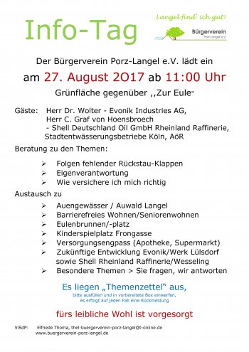 Am Sonntag, dem 27. August 2017, findet ab 11 Uhr unser diesjähriger Info-Tag statt – wie immer auf der Grünfläche neben der Kirche „St. Clemens“/ gegenüber der Gaststätte „Zur Eule“, Lülsdorfer Straße/Frongasse, Porz-Langel.